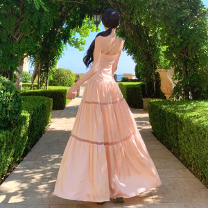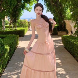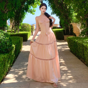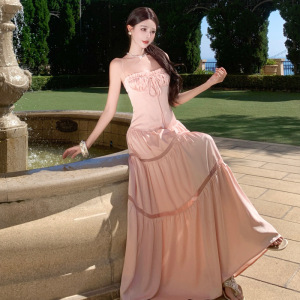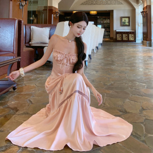 海边度假粉色缎面抽褶系带抹胸吊带连衣裙女夏掐腰镂空拼接连身裙