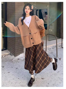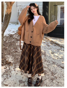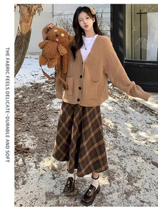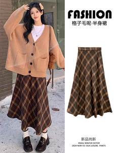 复古咖色格子中长款半身裙女秋冬季新款美拉德小个子a字毛呢伞裙