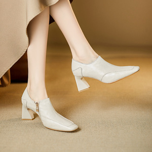 法式复古小踝靴春季粗高跟软皮羊皮拉链气质方头米白色深口女单鞋