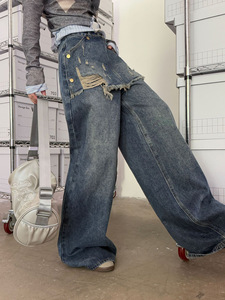 ME KAKAMEE十三行秋美式可拆卸破洞屁帘假两件阔腿牛仔裤女 C0528