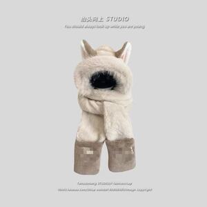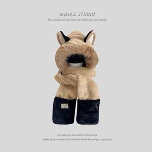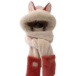冬季保暖护耳帽骑行手套围脖三件套火狐狸耳朵毛绒帽子围巾一体女
