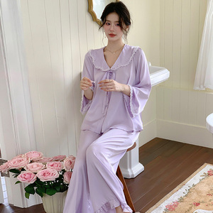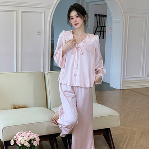法式睡衣秋季新款色丁薄款宫廷风甜美可爱长袖长裤家居服两件套