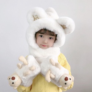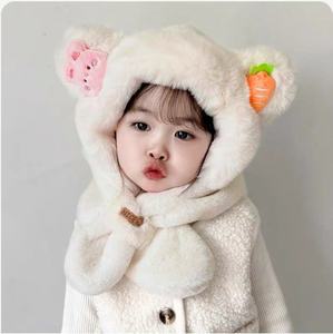 儿童毛绒帽子冬季围巾一体帽加绒卡通两件套可爱宝宝男女童护耳帽