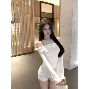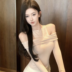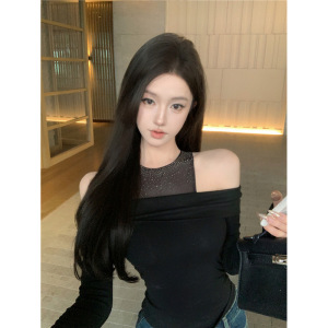 昕可达【撩心嗲妹】水钻网纱挂脖一字肩纯欲内搭打底针织衫上衣