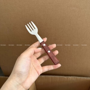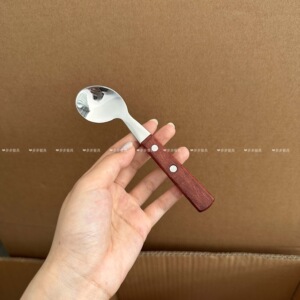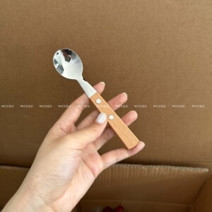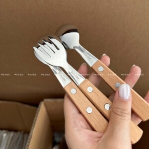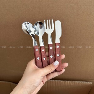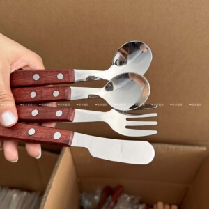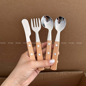 304不锈钢餐具榉木柄儿童刀叉勺套装夹柄柳钉复古甜品勺宝宝勺叉