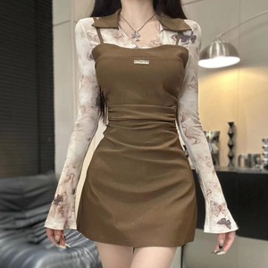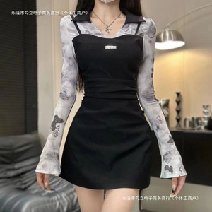 套装2025新款扎染上衣设计吊带衬衫秋季辣妹时尚连衣裙黑色款网纱