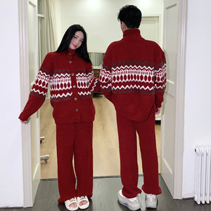 2025新款半边绒情侣睡衣女圣诞款费尔岛红色提花加厚保暖家居服男