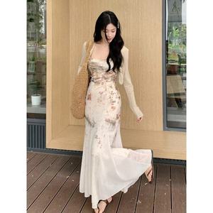 夏轻奢吊带连衣裙女春季收腰显瘦遮肚包臀长裙设计感国风碎花裙子