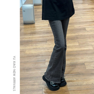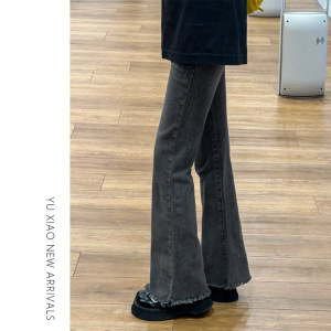 黑灰色毛边弹力微喇牛仔裤女秋季新款胖mm显瘦大码梨形身材喇叭裤