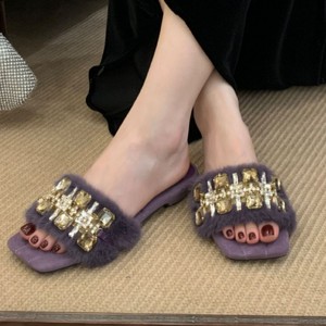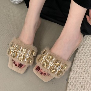 复古绒面方头水钻一字带凉拖女夏透明带平底拖鞋