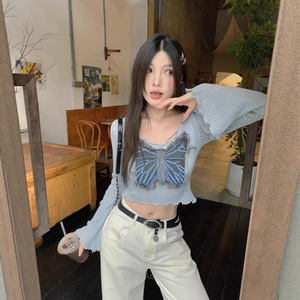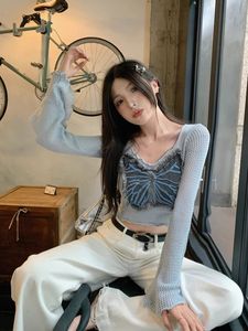 甜辣蝴蝶结长袖针织衫女秋季chic喇叭袖设计感小个子蓝色修身上衣