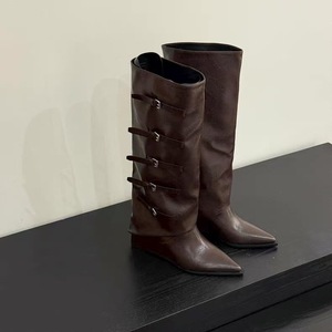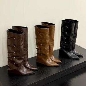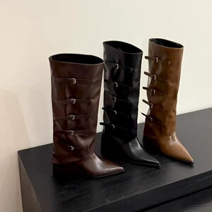 皮带扣厚底长筒靴女2025春秋季新款韩版粗跟小码套筒西部牛仔靴女