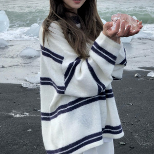 2025早秋新款巨好看的韩系温柔风穿搭时尚气质设计感条纹白色毛衣