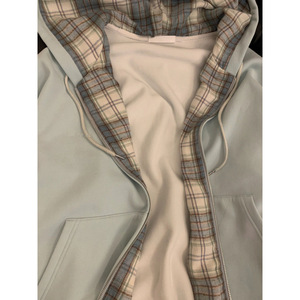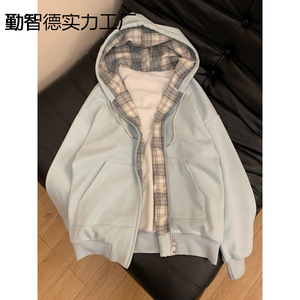 2025秋季新款上衣湖蓝色格子连帽卫衣外套女秋