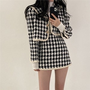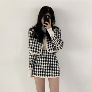 小香风套裙名媛千鸟格拼接短款外套高腰包臀半身裙洋气时髦两件套
