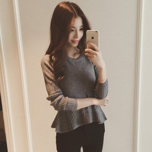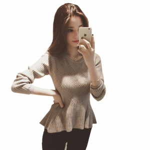 加厚秋冬女装荷叶边下摆圆领针织打底衫长袖套头毛衣紧身上衣
