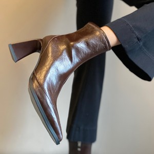 现货~法式尖头软皮瘦瘦靴高跟显瘦短靴女真皮气质侧拉链马丁靴冬