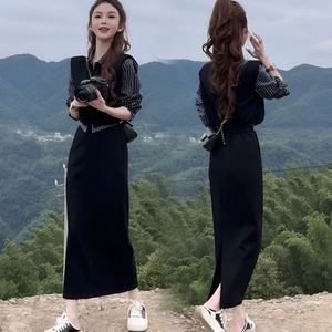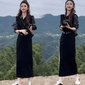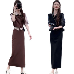 秋季新款时髦气质显瘦两件套女感条纹衬衫上衣半身裙时尚套装
