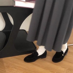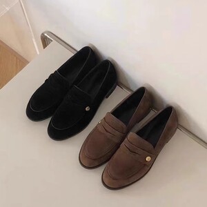 羊皮版~复古英伦风绒面百搭小金扣乐福鞋女粗跟圆头一脚蹬单鞋子