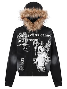欧美跨境印花毛领连帽卫衣男女同款上衣原宿高街暗黑哥特夹克外套