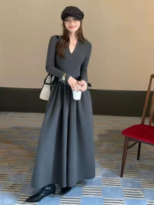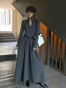 不退换E859长袖V领修身显瘦拼接赫本风配腰带连衣裙女