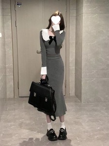 【配蝴蝶结】新款韩系娃娃领长袖修身连衣裙女显瘦包臀鱼尾长裙