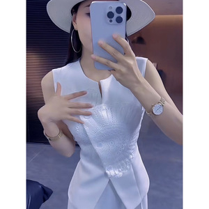 2025夏季新款重工刺绣蕾丝拼接收腰V领无袖上衣+高腰直筒裤两件套