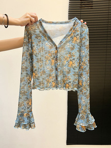 复古花边喇叭袖短款V领小外套早秋薄款老花网纱设计感外搭披肩女