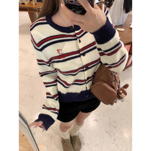 复古撞色条纹长袖针织开衫女2025秋冬季新款小狗刺绣宽松外套上衣