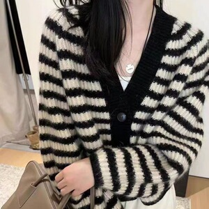 秋冬新款欧洲站V领条纹针织开衫女士时尚休闲撞色复古风毛衣外套