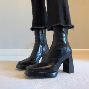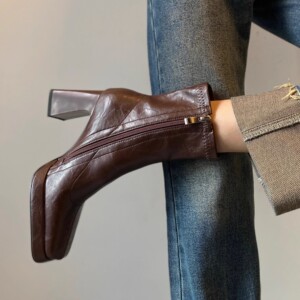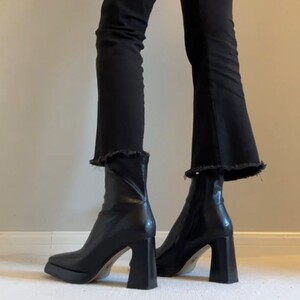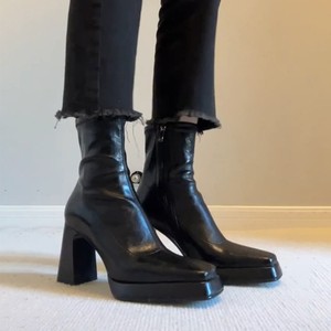 牛皮版~法式高跟真皮短靴女防水台增高弹力马丁靴方头粗跟瘦瘦靴