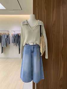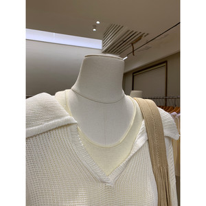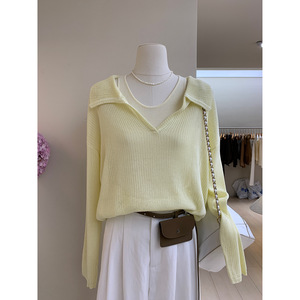 早秋显嫩黄色镂空拼接背心假两件针织衫韩系V字翻领套头宽松上衣