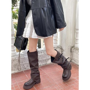 小个子厚底黑色长筒骑士靴女2025春夏新款设计感褶皱堆堆靴