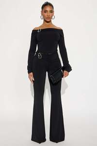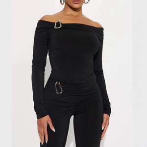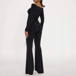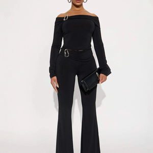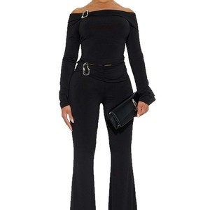 跨境欧美2025秋季女式长袖一字肩褶皱T恤上衣高腰修身微喇裤套装