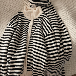 【现货】连帽针织条纹半边绒保暖睡衣女2025新款套装家居服可外穿