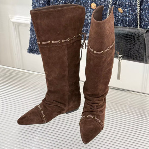 高端女鞋2025秋季真皮女鞋尖头显瘦褶皱堆堆小个子铆钉细跟长靴