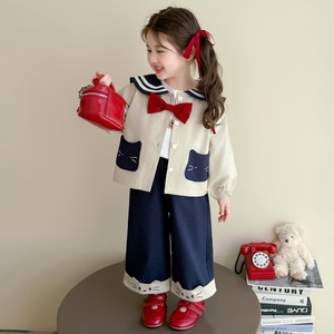 女童秋款套装新款女宝宝洋气时髦海军领超火两件套小猫咪卡通衣服