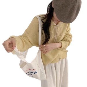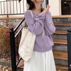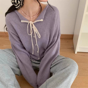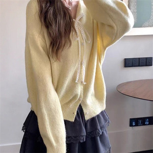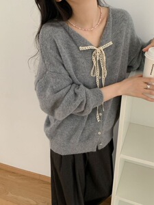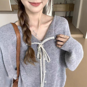 设计感复古蕾丝系带开衫毛衣女秋季大码胖MM显瘦宽松气质针织上衣