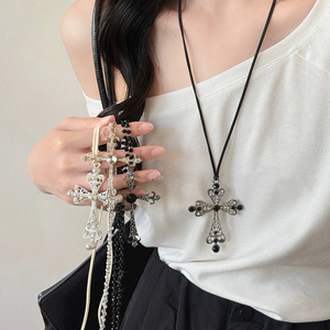 欧美跨境嘻哈珍珠镶钻十字架系带项链辣妹哥特夸张个性颈链毛衣链