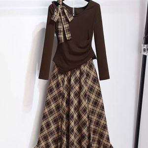 不规则斜肩长袖上衣雪纺格纹半身裙女套装薄款2025春秋新款连衣裙