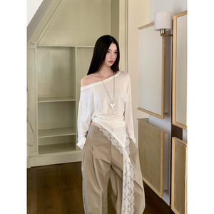 实拍现货现货法式露肩蕾丝飘带斜肩不规则长袖恤