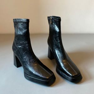 马皮法式软粗跟短靴女2025款秋冬加绒复古方头高跟弹力瘦瘦马丁靴