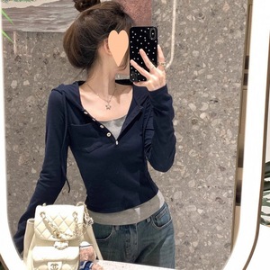 厂家直销秋季修身显瘦百搭假两件连帽上衣短款撞色拼接正肩长袖T