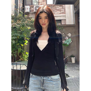 2025秋季假两件撞色长袖T恤女秋季修身显瘦打底衫百搭内搭上衣潮