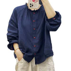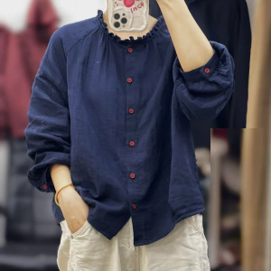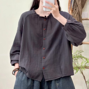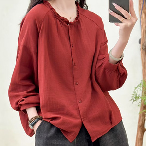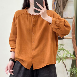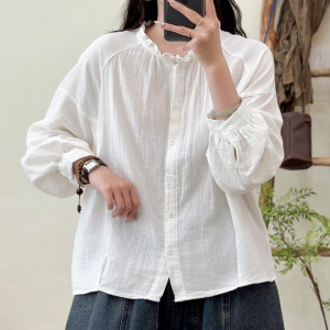 韩系时尚双层棉纱衬衫女木耳领衬衣宽松显瘦简约百搭衬衣上衣潮