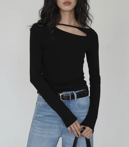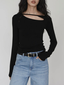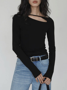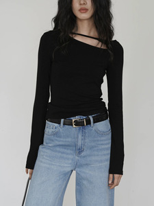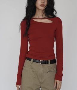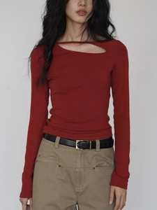 红色单侧挖空长袖上衣女设计感小众春秋季显瘦打底T恤