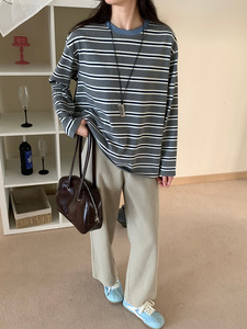 韩系Egg2025秋季新款条纹长袖T恤女圆领条纹小蜜蜂复古叠穿打底衫