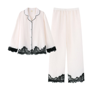 小香风睡衣女春秋季蕾丝长袖小翻领韩版开衫凉感家居服长裤可外穿