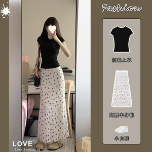 套装女春夏新款韩系辣妹短袖恤上衣高腰显瘦碎花鱼尾半身裙