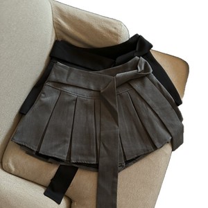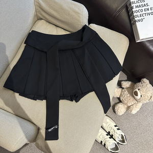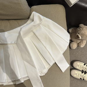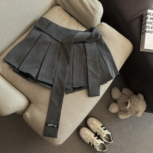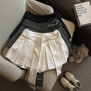 复古拼接假两件绑带a字裙女秋辣妹高腰百褶半身裙减龄不规则短裙